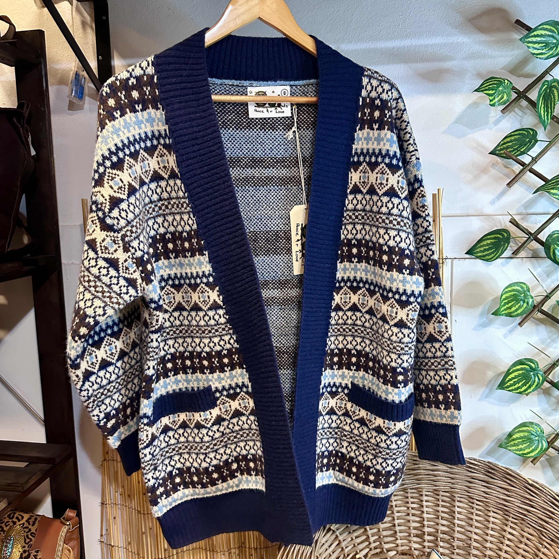 Cárdigan de punto suave con estampado jacquard de inspiración étnica, combinando tonos azul marino, azul claro, crema y marrón. Un diseño armonioso y sereno que transmite calma y estilo natural.