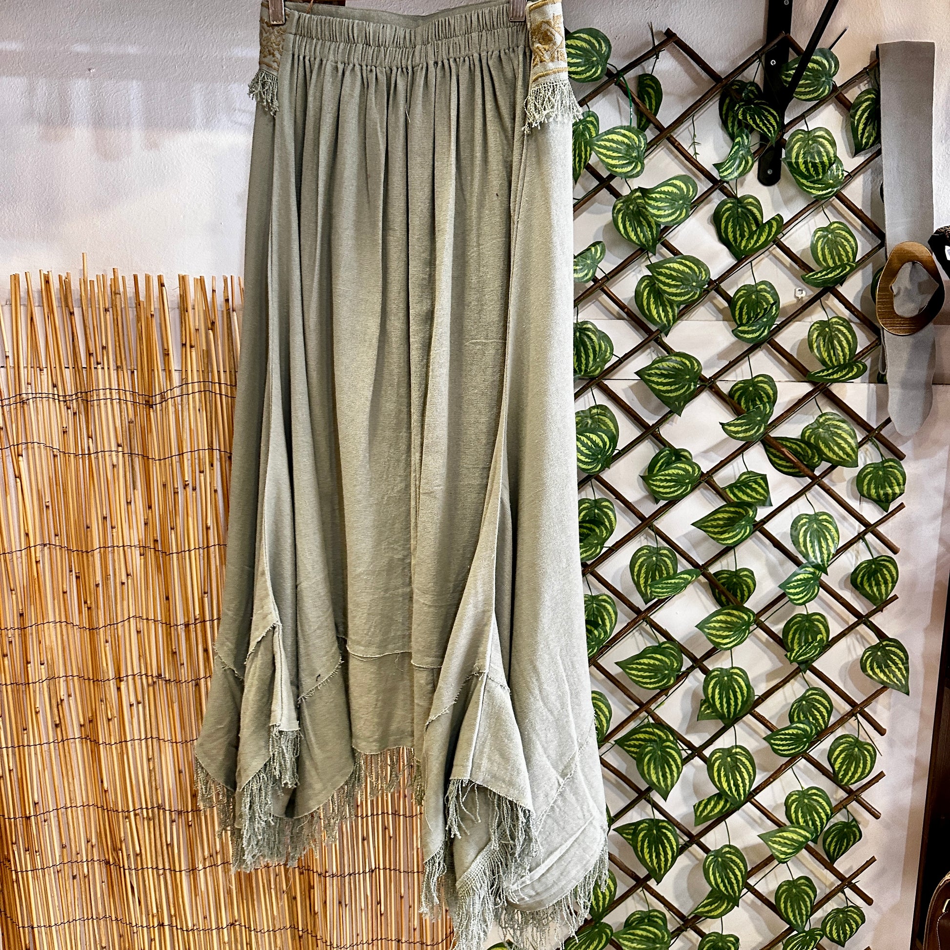 Falda larga de estilo bohemio en tono verde oliva con bordados étnicos y detalles artesanales. Su diseño fluido con caída ligera y acabado con flecos aporta movimiento, naturalidad y un aire relajado.